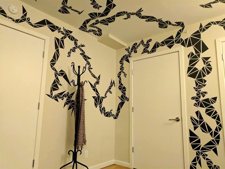 Decals work best on a clean white space, but even if your walls are brick, a mess of pipes, or otherwise unsuitable for decorating, your ceiling is also a great area for a DIY mural. Using cardstock, cut out an easily repeatable shape, like a triangle, and tape it in a pattern on your wall.