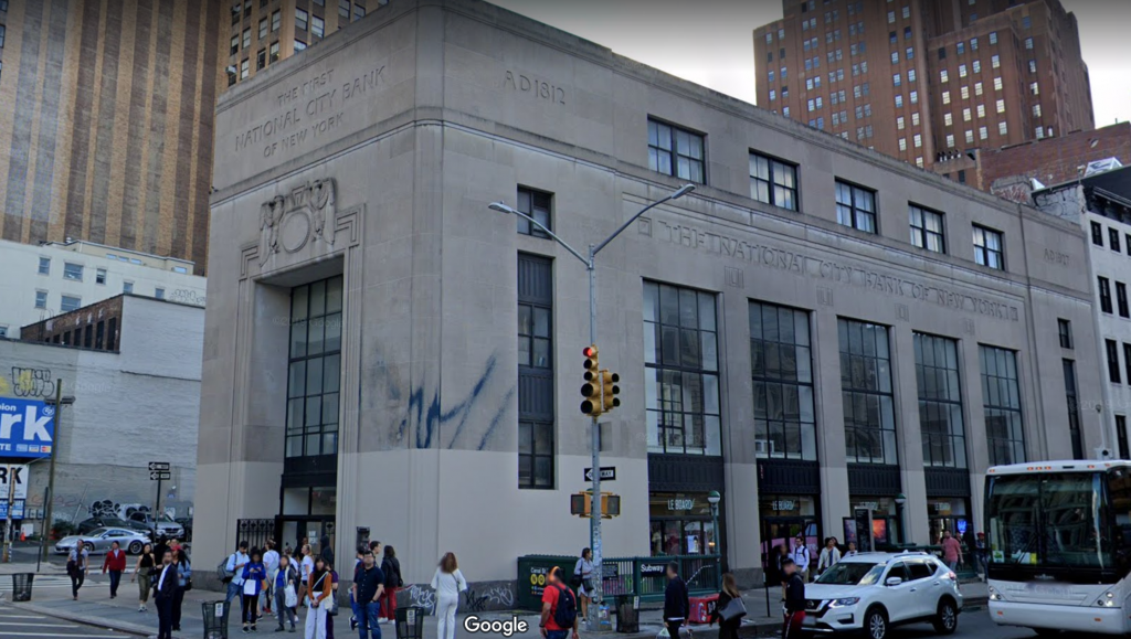 Completed in 1927, the building was designed by Walker & Gillettte in the Art Moderne style, a more streamlined version of Art Deco that originated in the United States. The building featured a monumental entrance on Broadway that opened onto the soaring banking area and had offices on the upper floor. Architectural critic Lewis Mumford said, “The note of modernism pervades this structure… and is splendidly successful.” The bank changed names a few times and finally became Citibank from 1976 until they moved out in the 1990s. Architect Joseph Pell Lombardi remodeled the building for retail use, leaving the exterior largely intact. It’s since been home to several temporary pop-ups, most recently the gym Shock Therapy.