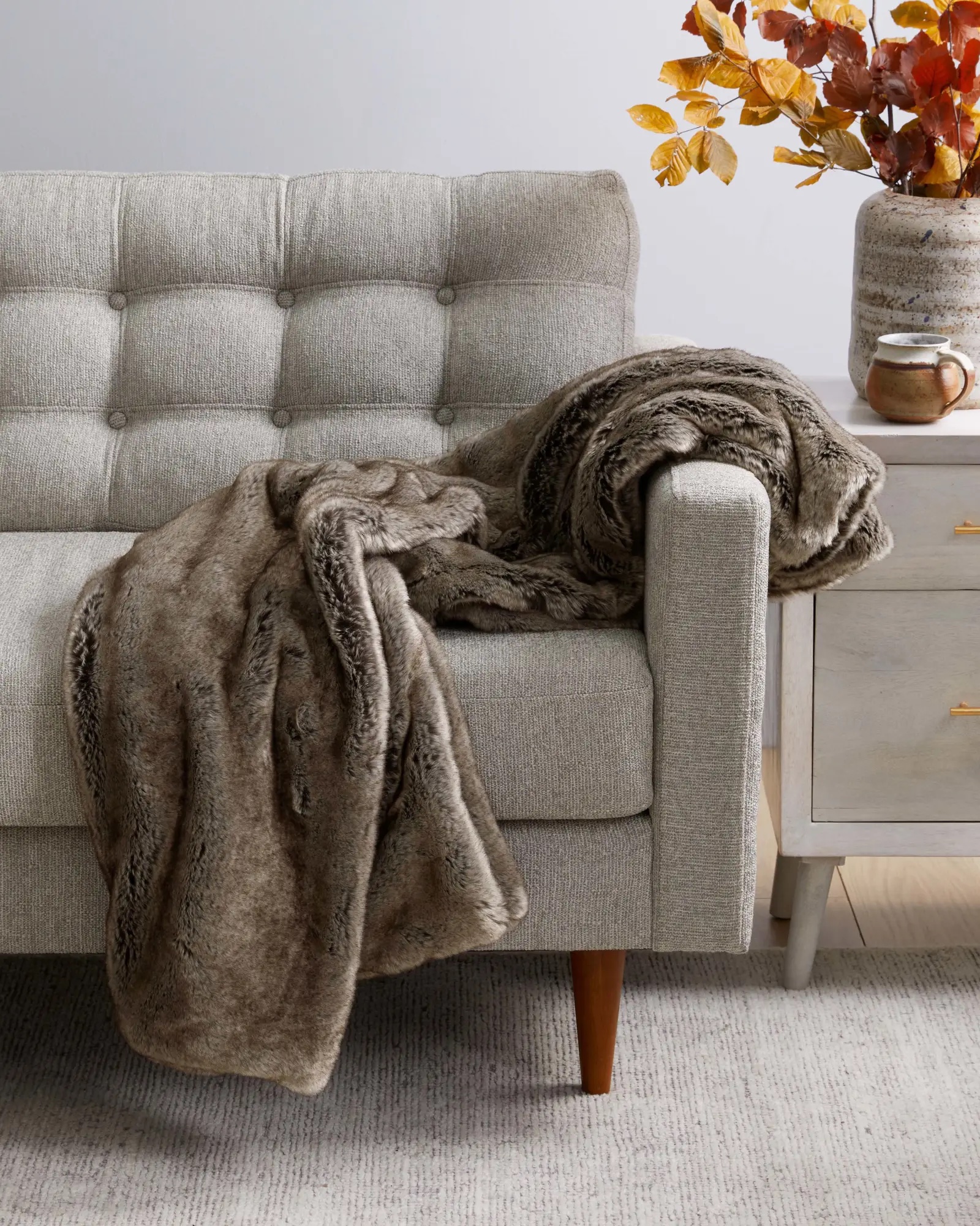 If you like the look and feel of fur, this Quince Luxe Faux Fur Throw is a sustainably-sourced option. It has a faux fur front made of 85% acrylic and 15% polyester. The velvety back side is made of 100% polyester. The throw is also machine washable. It’s available in 50” x 60” and also 60” x 80” and in three colors: timber wolf, silver fox, and arctic hare. Luxe Faux Fur Throw, $89 at Quince |