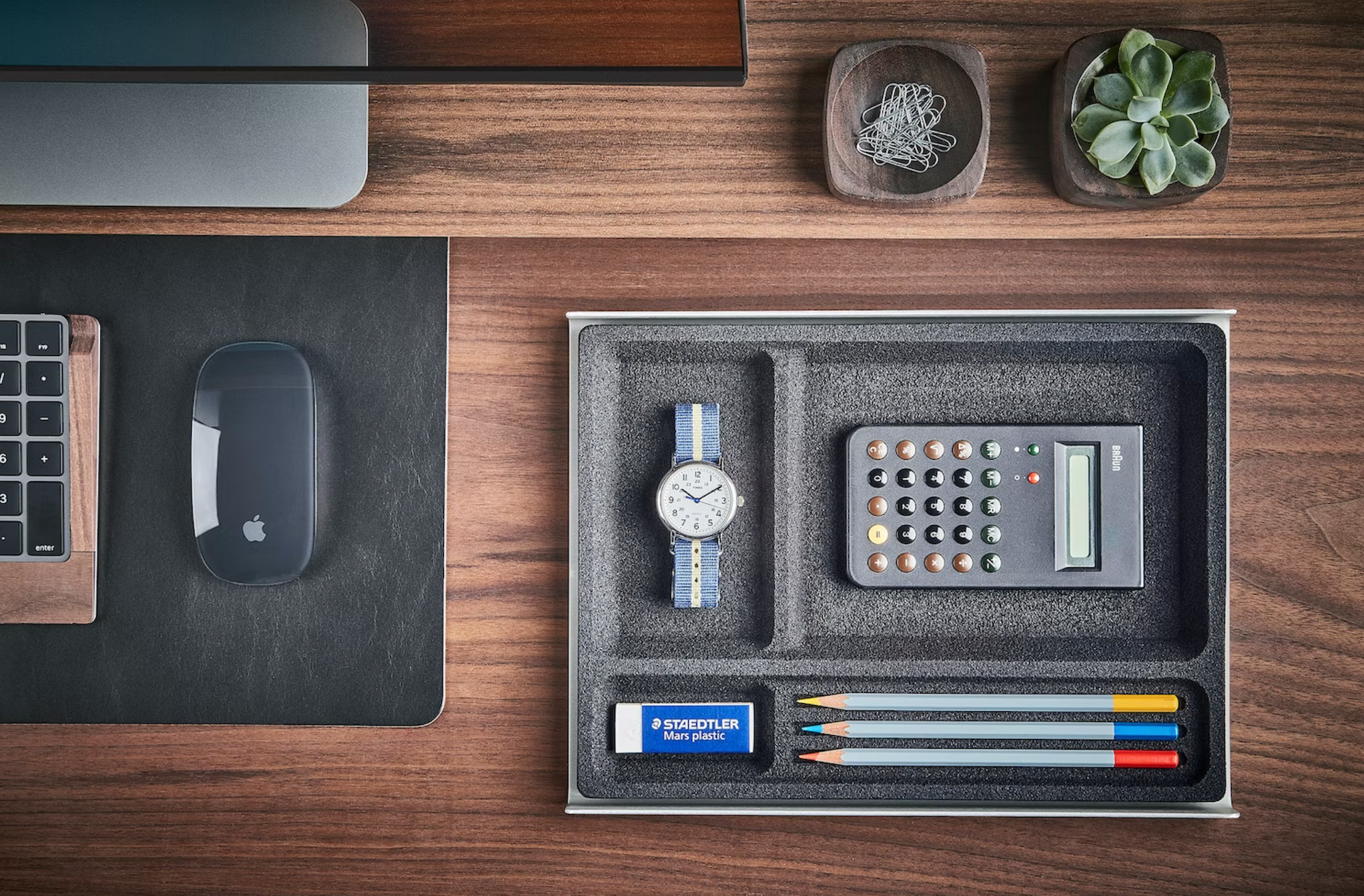 This clever desk tray fits easily into your desk drawer and keeps your essentials organized and out of the way (although it’s also stylish enough to keep on top of your desk as well). The desk tray has four different compartments for pens/pencils, calculators, sticky notes and note pads, staples, gem clips, etc. The tray is made of 5052 aluminum and natural cork. It’s available in both a dark and a light color option. Desk Tray, $150 at Grovemade |