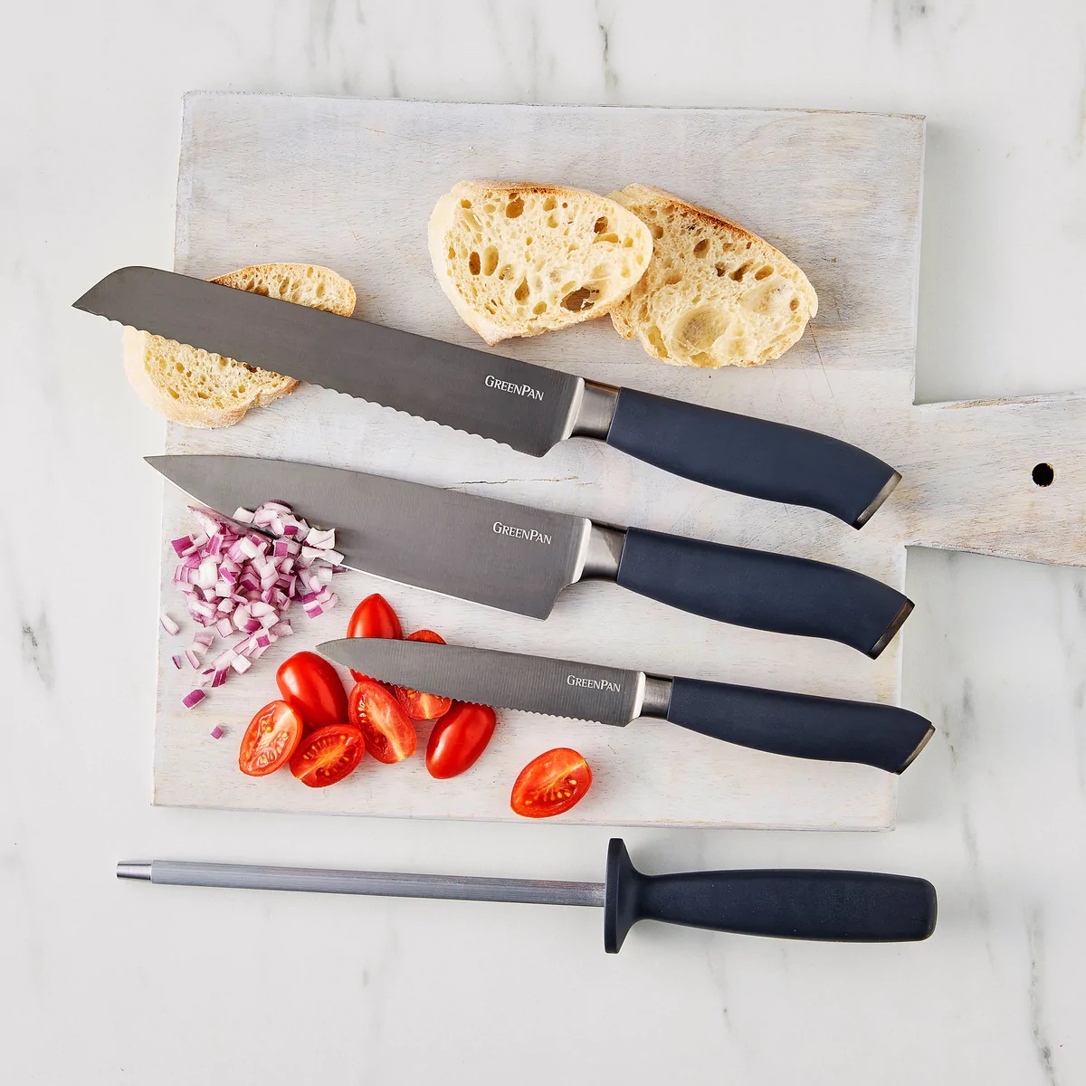 A dull knife set makes meal prep harder, and also increases the chances of injuring yourself. This Titanium cutlery set is made of recycled steel, and each precision-cut blade is heat-treated up to 2,000 degrees Fahrenheit to ensure that it’s durable. Each blade is hand-finished and has a titanium coating to guard against chipping or peeling. The ergonomic handles are slip-resistant and the knives are dishwasher safe (although hand-washing is recommended). The set includes a chef’s knife, bread knife, Santoku knife, utility knife, serrated utility knife, paring knife, six steak knives, sharpening steel, shears, and a rubberwood knife block. Titanium Cutlery 15-Piece Knife Block Set, $285.99 at GreenPan |