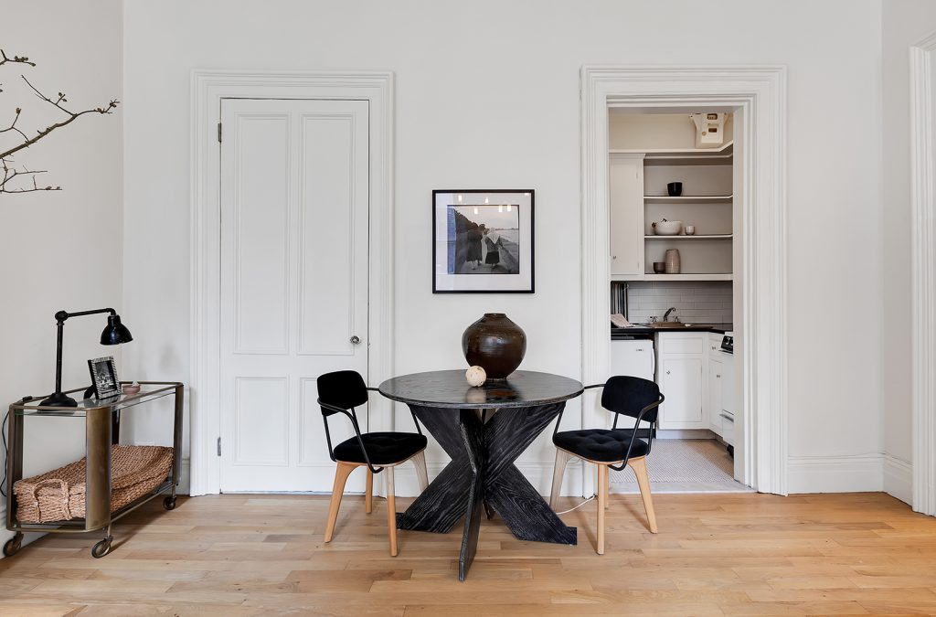 The thoughtful decor features a palette of black and neutrals against pristine white walls. None of the selected objects detract from the home’s original details, including a marble fireplace and original shutters on the large, south-facing windows. There’s a separate kitchen with custom cabinets and a subway tile backsplash. Though not pictured, french doors lead to the bedroom, which is small but comes with a full wall of built-in storage.