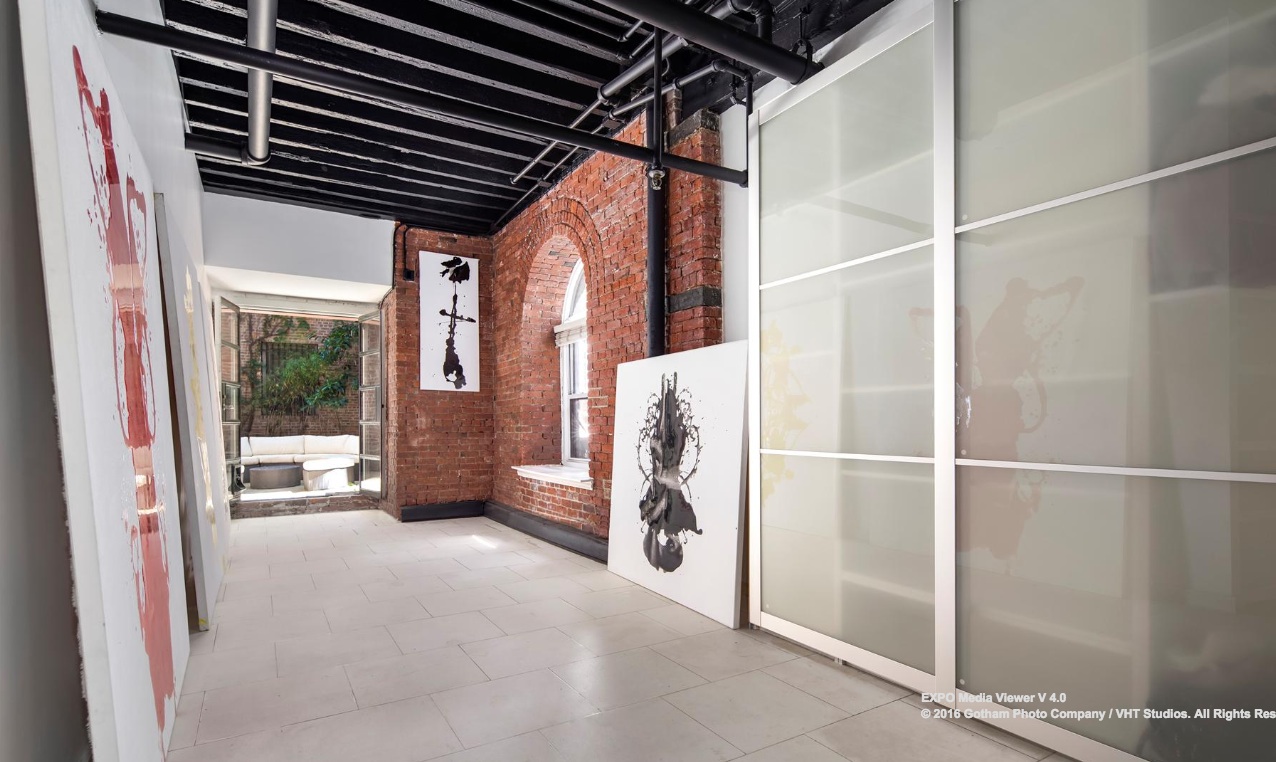 Through another large sliding glass door is the spacious patio. The high, brick-lined walls mean this space feels especially private and cozy, like a world unto itself. As the listing points out, it’s nice for any season, in night or daytime. We’ve never seen an outdoor space look so wonderfully lofty!
