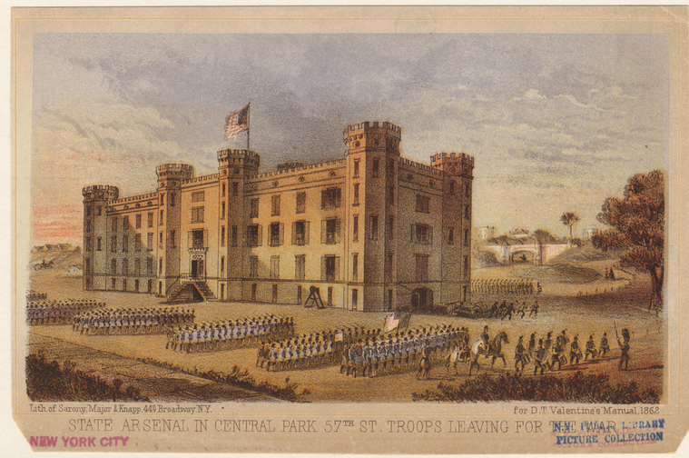 The Arsenal seen from “Fifth Avenue Road” c. 1862, via NYPL