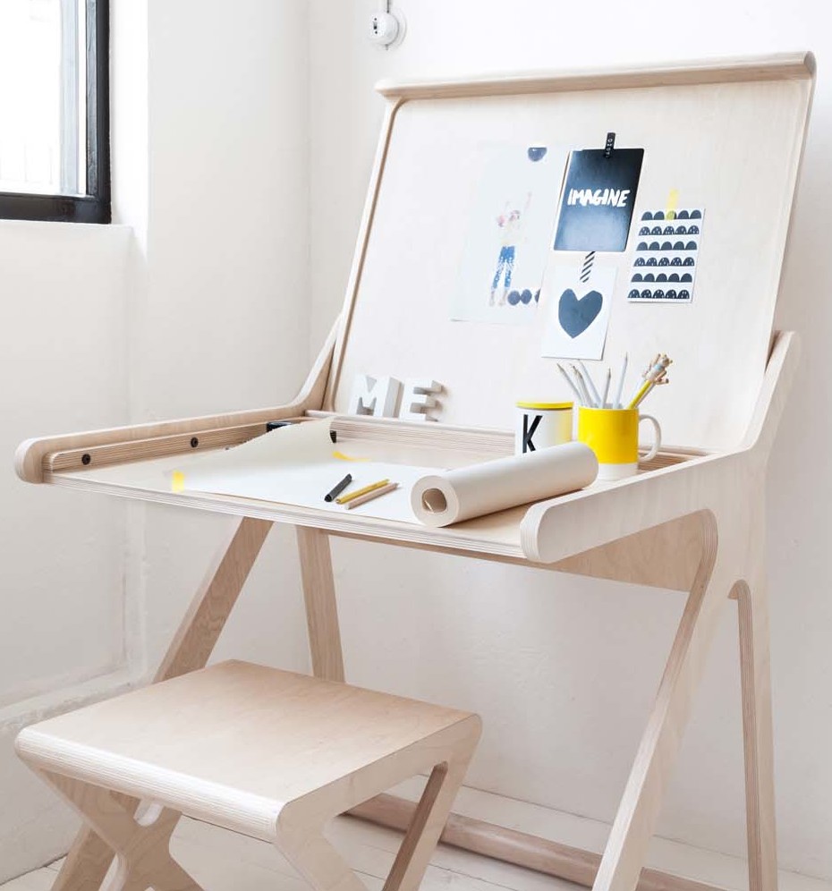 This funky table from furniture retailer Rafa Kids is cleverly designed to resemble the letter K when viewed from the side (hence its name, K Desk). The design also features rounded corners (to keep little noggins safe) and a useful lid that reveals a second table top when lifted. The underside of the lid also doubles as a bulletin board to hang drawings or photos.
