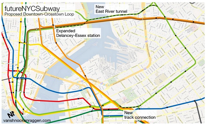 The Downtown loop would take the G train’s current Brooklyn route then head into Manhattan using the N, R tunnel. When it reached Manhattan, it would use the same Centre Street tracks as the J and Z trains, but to head back to Brooklyn, Lynch proposes a new East River tunnel under the Williamsburg Bridge (which he cites as a great way to alleviate overcrowding on the L train). It would also require a new platform and track be built at the abandoned trolley terminal at the Essex-Delancey station.