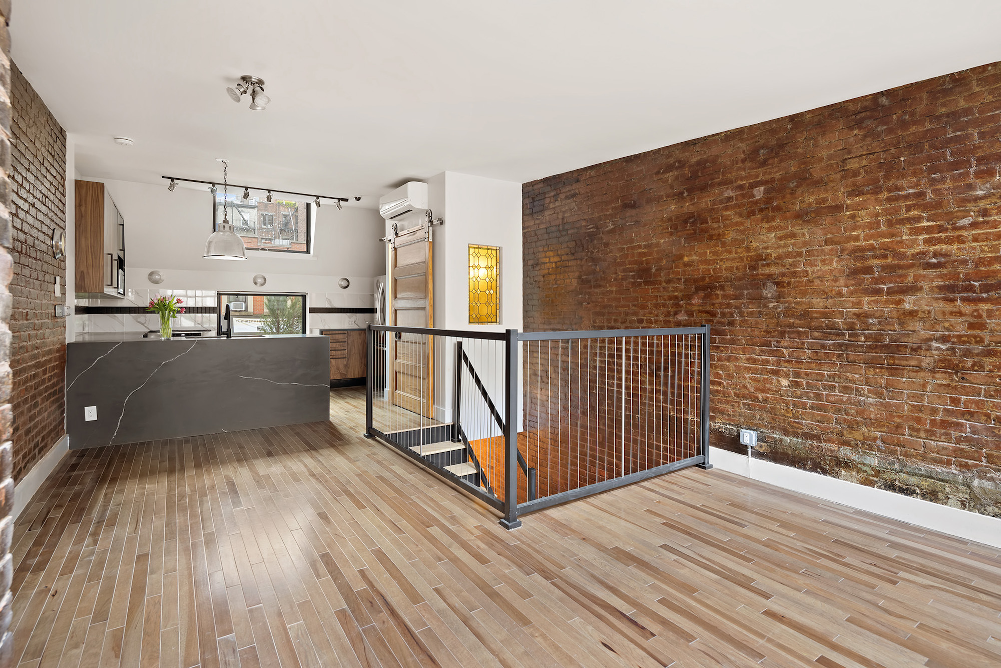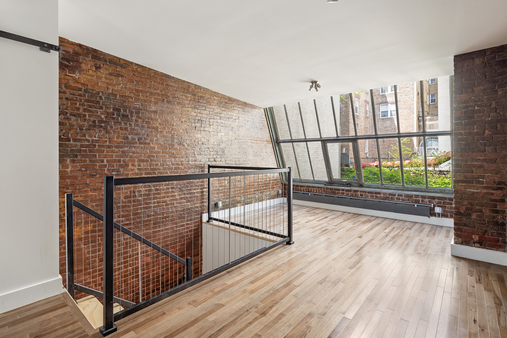On the upper floor, high ceilings, exposed brick, and 1890s stained-glass-and-steel factory windows evoke the building’s days as a light-filled sculptors’ studio. In addition to a half-bath, this floor offers a custom-designed kitchen with waterfall quartz countertops, custom cabinetry, a dishwasher, an induction range, and a French-door refrigerator.