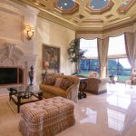 The open layout begins with the grand living room, which has gorgeous coffered ceilings and an intricate marble fireplace. Through a huge marble arch, more living spaces sit under a vaulted ceiling.
