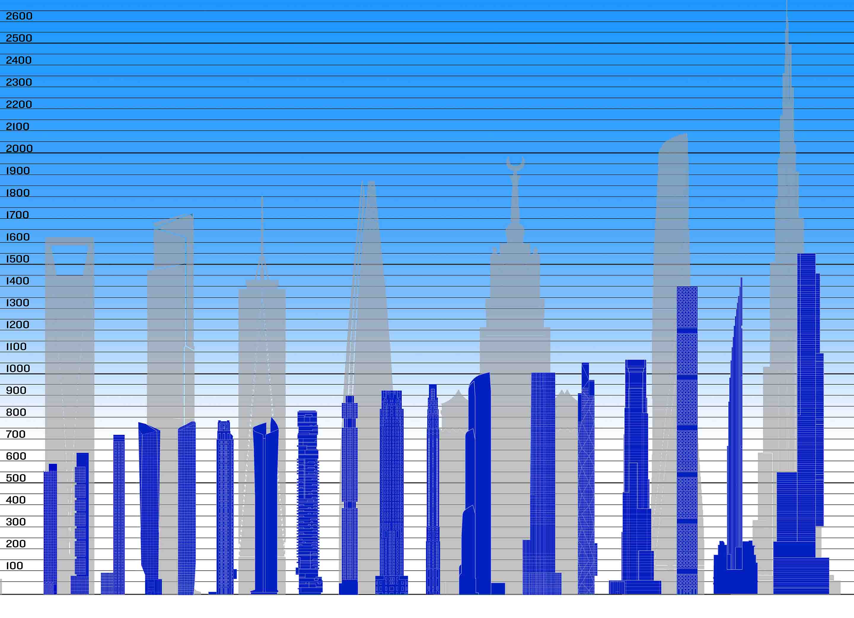 Gray silhouettes from left to right: Shanghai World Financial Center, CTF Finance Centre, One WTC, Lotte World Tower, Mecca Royal Clock Tower, Shanghai Tower, Burj Khalifa. Click link here to enlarge >>