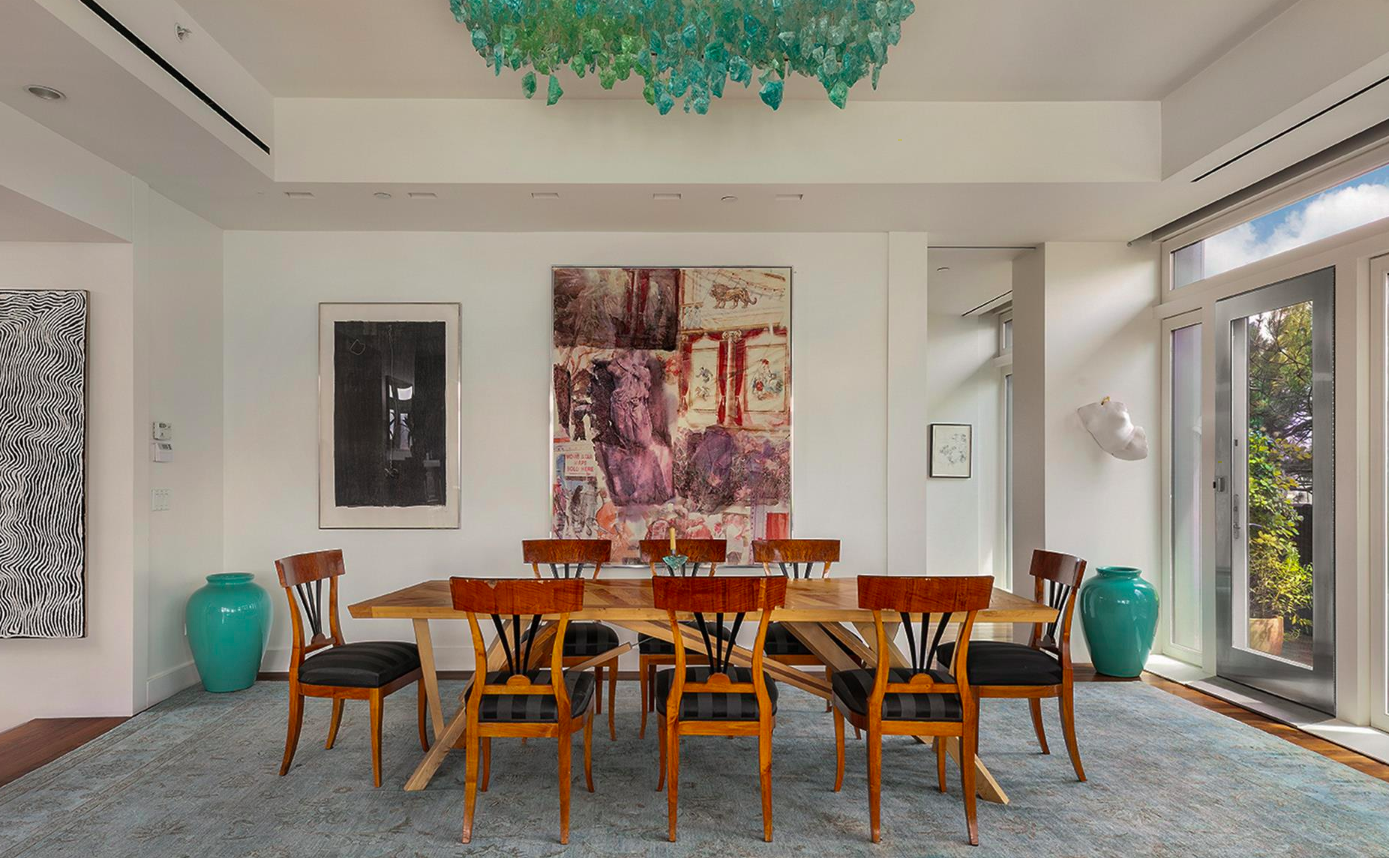 A secured elevator leads into a private vestibule and then to the sky-lit gallery. The open living/dining room is surrounded by floor-to-ceiling windows.