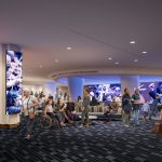 The hall’s “Grand Promenade” is an open and central space with a large black granite bar as the anchor. The first tier overlooks feature more bars and people-watching opportunities. More details about a new restaurant, patrons lounge, and “music box” are expected in the coming weeks.