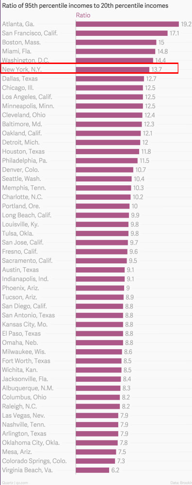 The report also took a look at those closer to the bottom of the distribution—those earning more than only 20 percent of all other households. The ratio between the top and bottom samples shows the level of disparity. For example, the top 5 percent in NYC earn about 13.7 times more that the 20th percentile.