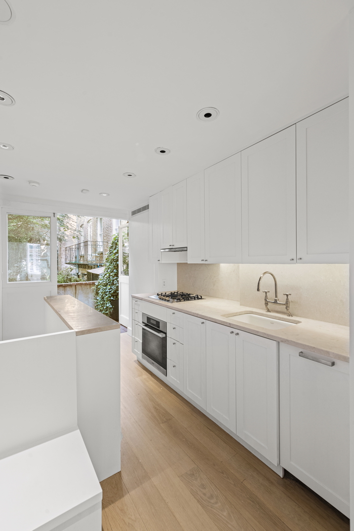 Reports have said the interior of the house measures just about eight feet wide, and city records note the total square footage at 999. The first floor has a street-facing living room and a rear kitchen with custom millwork and Italian marble countertops that opens through French doors to the shared backyard.