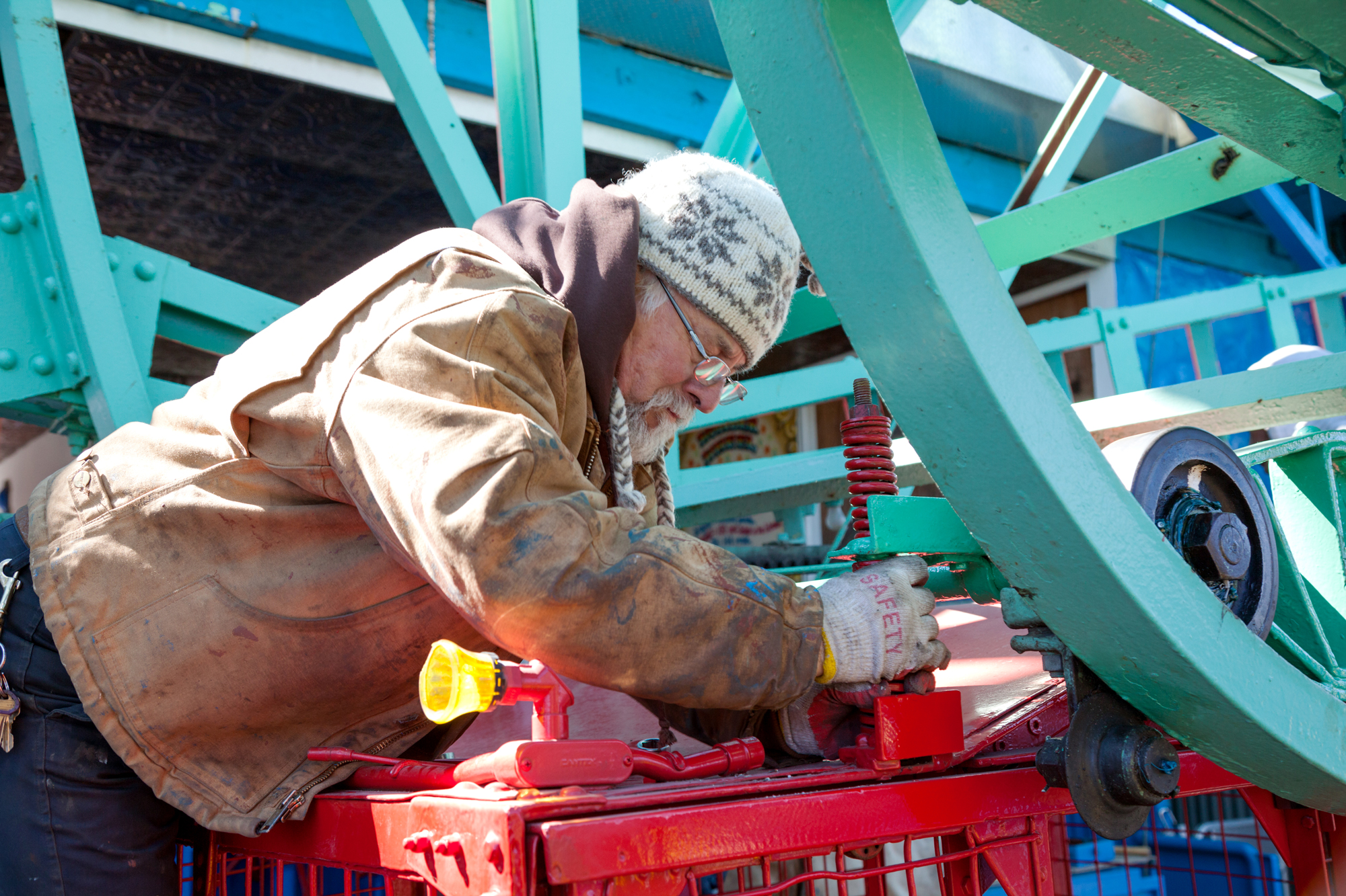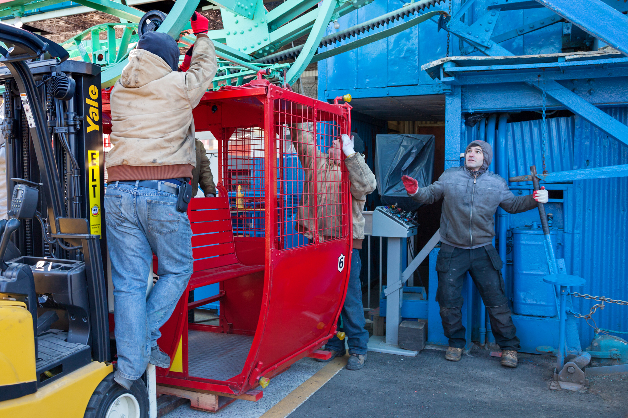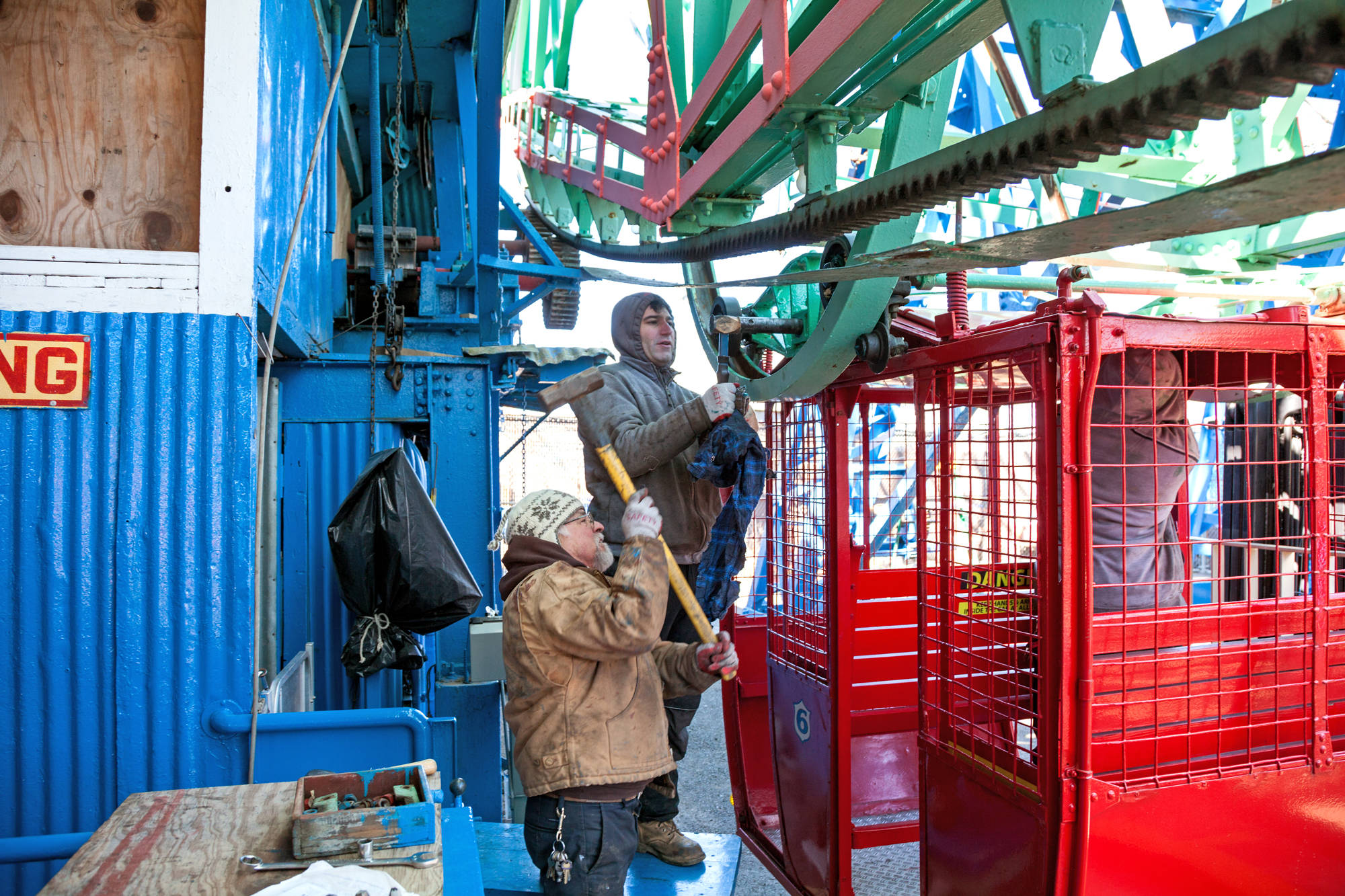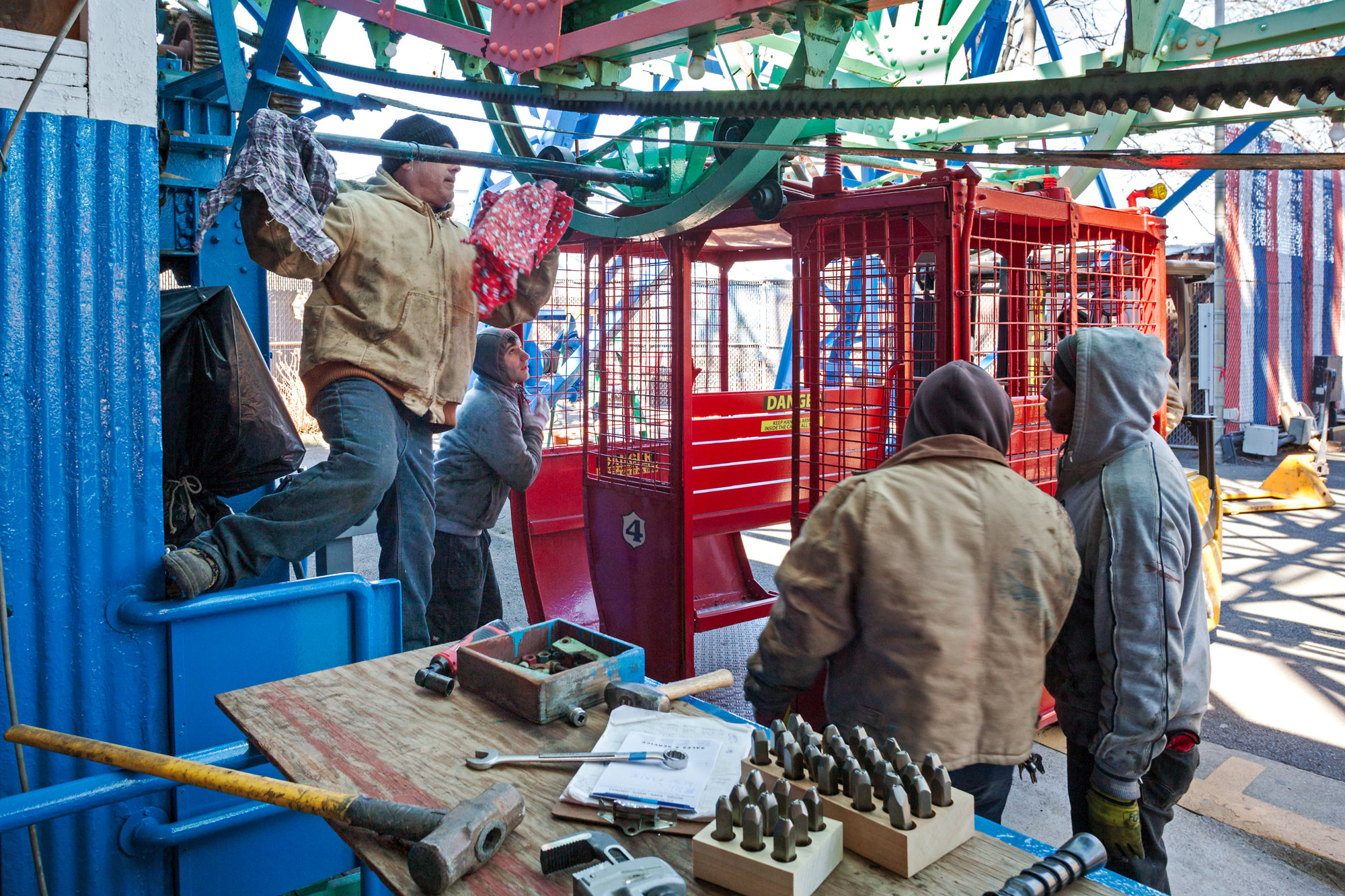 The annual event of reinstalling the cars is often regarded as the first sign of Spring in Coney Island. The weather, however, was anything but Spring-like, with howling winds off the Atlantic and a jet-engine-like kerosene heater wheeled out to warm not only the crew but the grease necessary to install the Wonder Wheel’s cars back on its tracks, first the red and blue swinging cars and then the stationary white.
