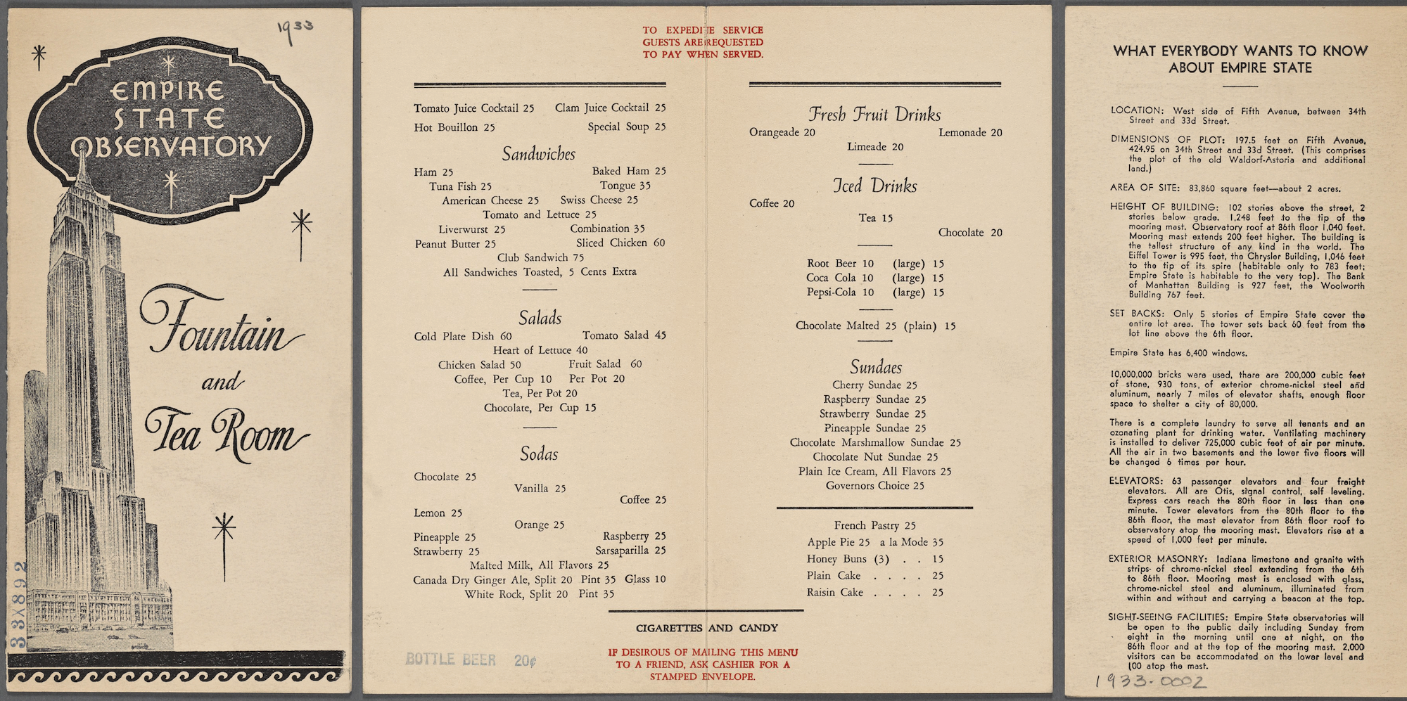 The New York Public Library recently digitized 18,000 of its 40,000 restaurant menus, which range from 1851 to 2008, including this one from the Empire State Building in 1933. As you'll see, sandwiches (ham, peanut butter, and tomato and lettuce, to name a few) were a mere 25 cents, the same price as their six types of ice cream sundaes and ten flavored sodas. In terms of actual food, your only choice other than a sandwich would've been a pretty blah-sounding salad, some pastries, or a selection of "candy and cigarettes."