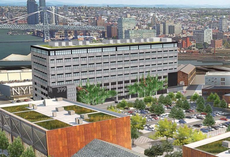 Once a shipyard where World War II warships were produced, the 300-acre Brooklyn Navy Yard is undergoing a major development to become a multi-use industrial and commercial mecca. Steiner Equities Group is overseeing the area’s reinvention and as YIMBY learned, the developer has filed permits for a mixed-use building at 399 Sands Street. Designed by Dattner Architects, renderings reveal a nine-story building with a concrete facade and lots of greenery on its roof, as well as new views of the site as a whole and the planned Wegmans grocery store.