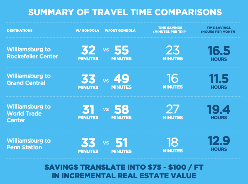 Levy, who is also a Williamsburg resident, came up with the idea over two years ago on a ski trip when he observed not only how quickly the gondolas moved, but how comfortable they were. From there, Levy spent two years investigating the technology available and conducted several preliminary studies on what it would take to bring a comprehensive gondola system to a city like New York. What he found was that implementation would be relatively inexpensive and quickly deployable.