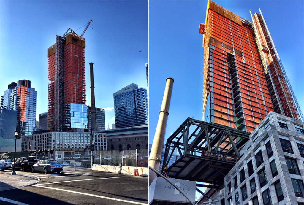 Work has moved forward swiftly on the the plan’s first two towers. The shorter of the pair, known as One West End , has just topped off its 491-foot concrete skeleton and is being developed through a partnership between the Elad Group and Silverstein Properties. The robust 41-story spire is the second tallest building on West End Avenue, only behind its more anonymous 521-foot-tall rental neighbor 21 West End.