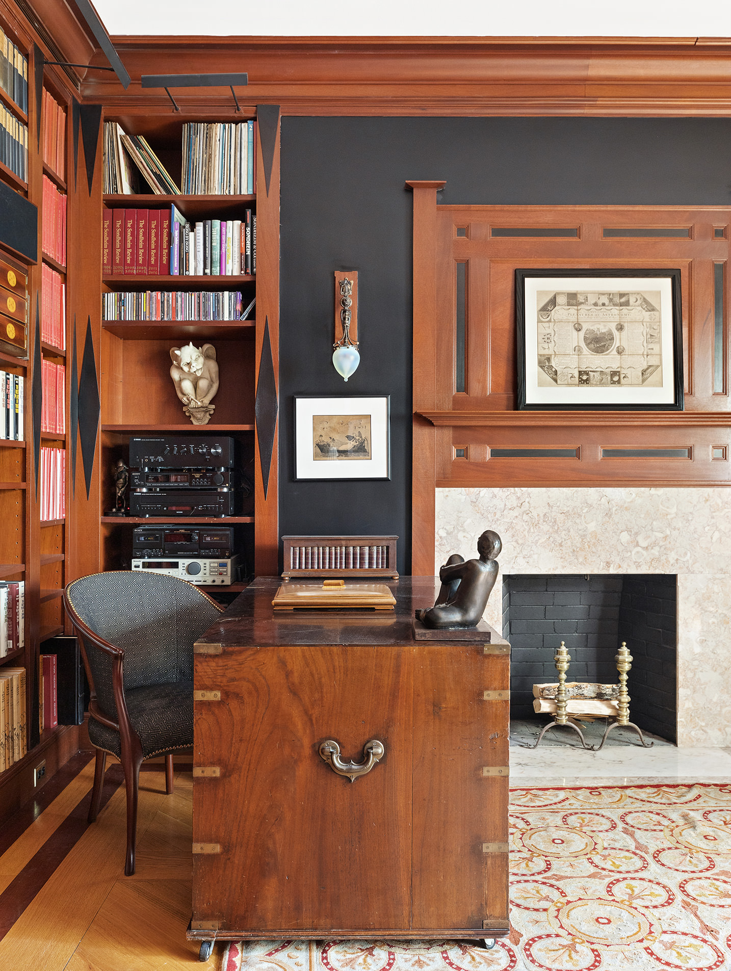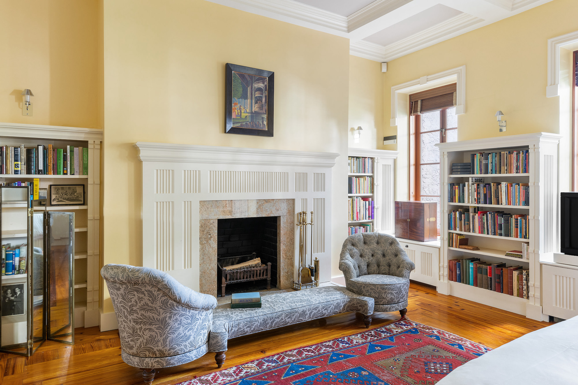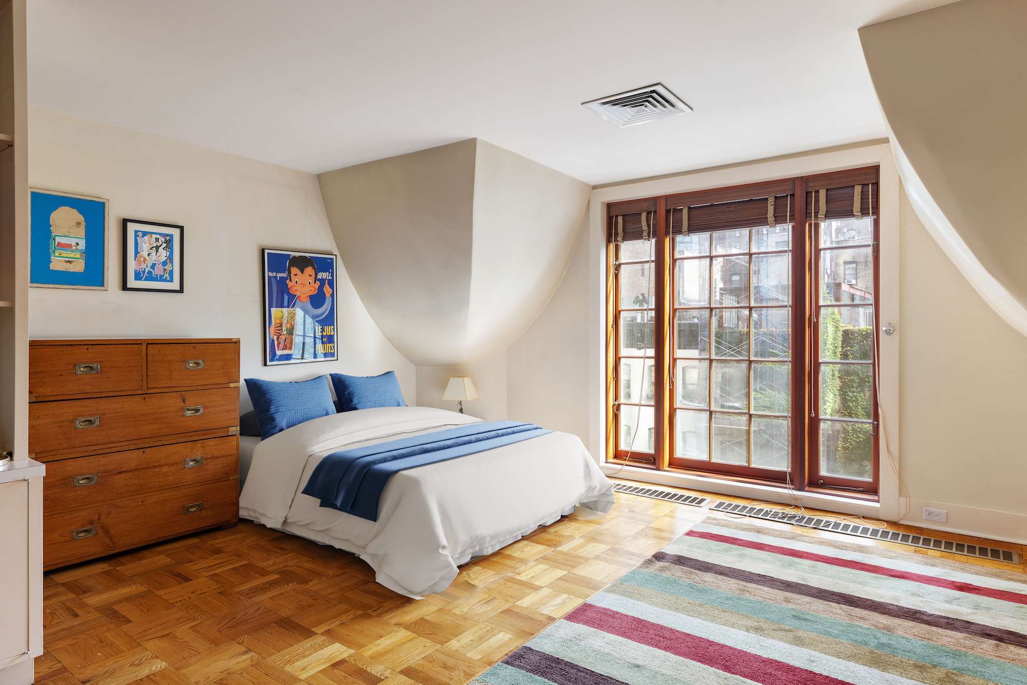 Occupying the entire fourth floor is the home’s primary suite. The bedroom is framed by custom millwork and a wood-burning fireplace. The bath features a separate shower and deep soaking tub, and a spacious dressing room overlooks the Manhattan street below.