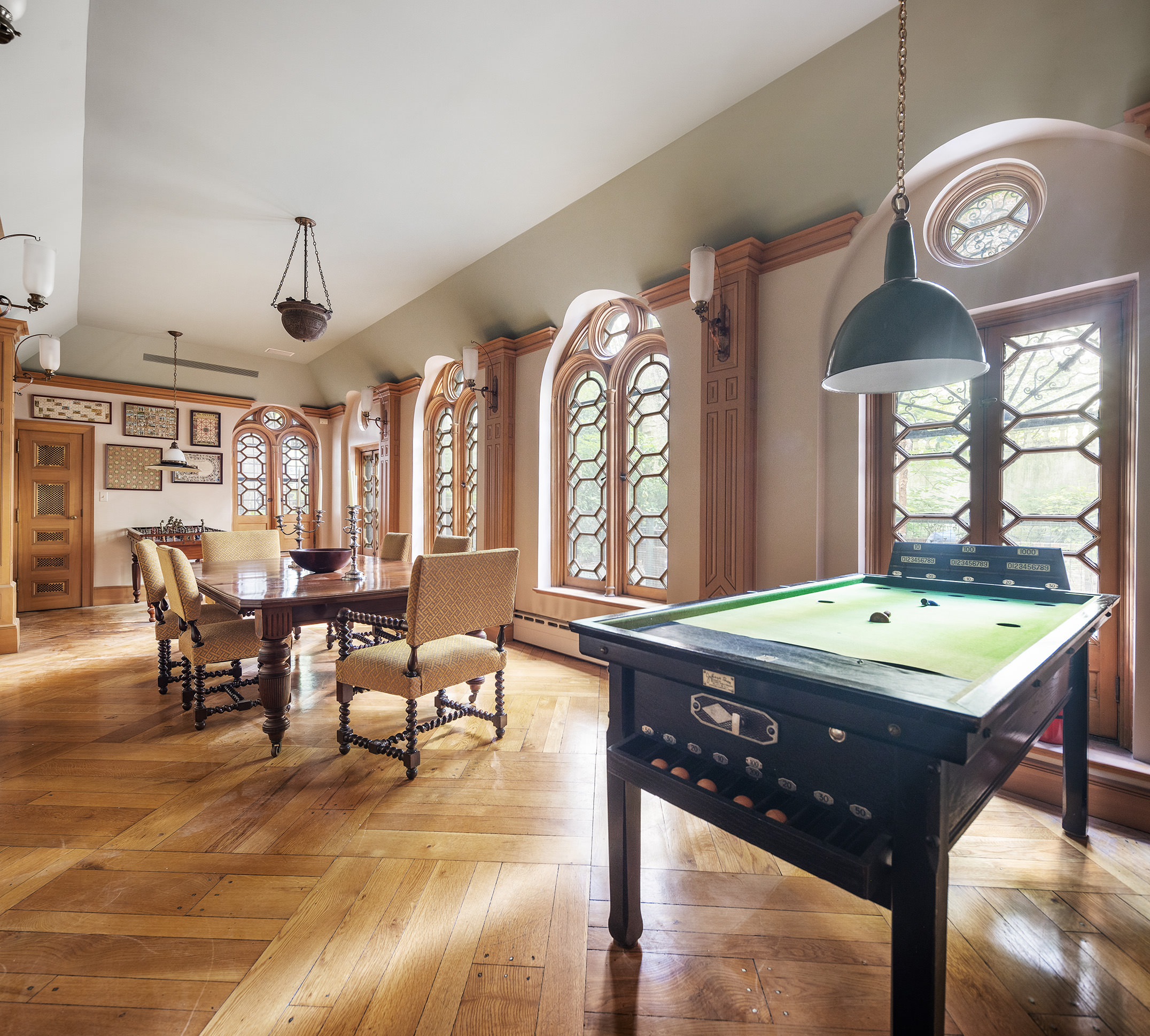 Perhaps the best reminder of the home’s iconic former resident is the second-floor music studio. A music library features a wood-burning fireplace and a baby grand piano. A dramatic solarium is framed by a wood arch and original stained-glass windows.