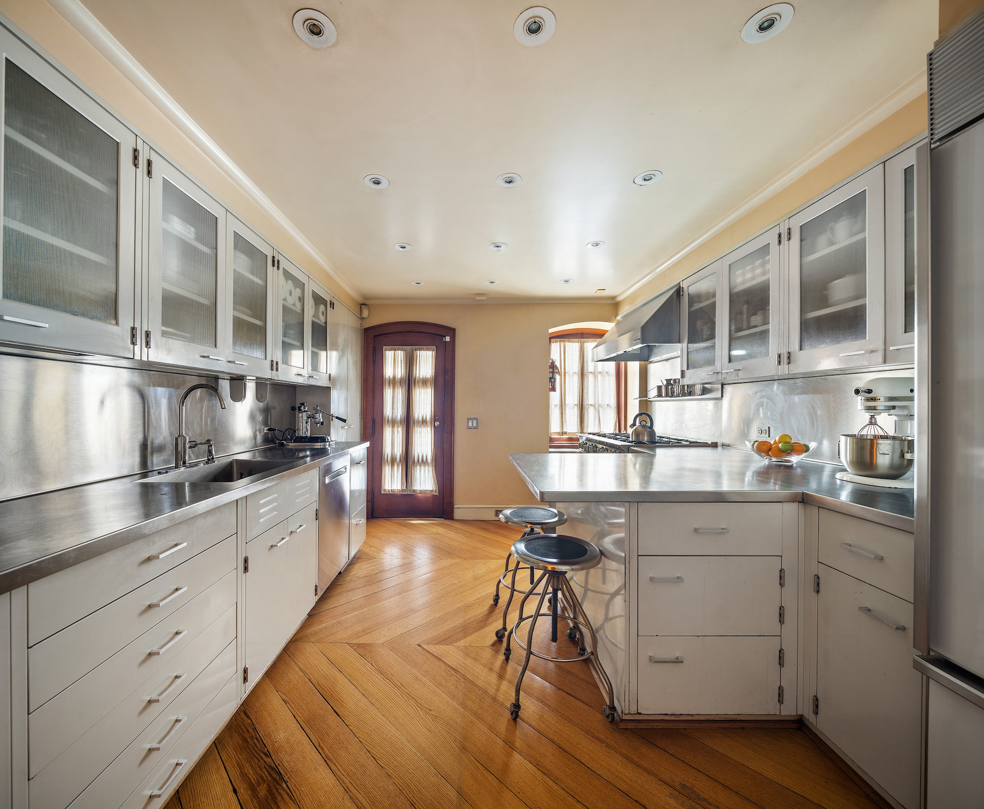 On the third floor are two bedrooms. In one bedroom is a wood-burning fireplace and ensuite bath. Between the bedrooms is a convenient and renovated kitchen with a SubZero fridge and Miele appliances.