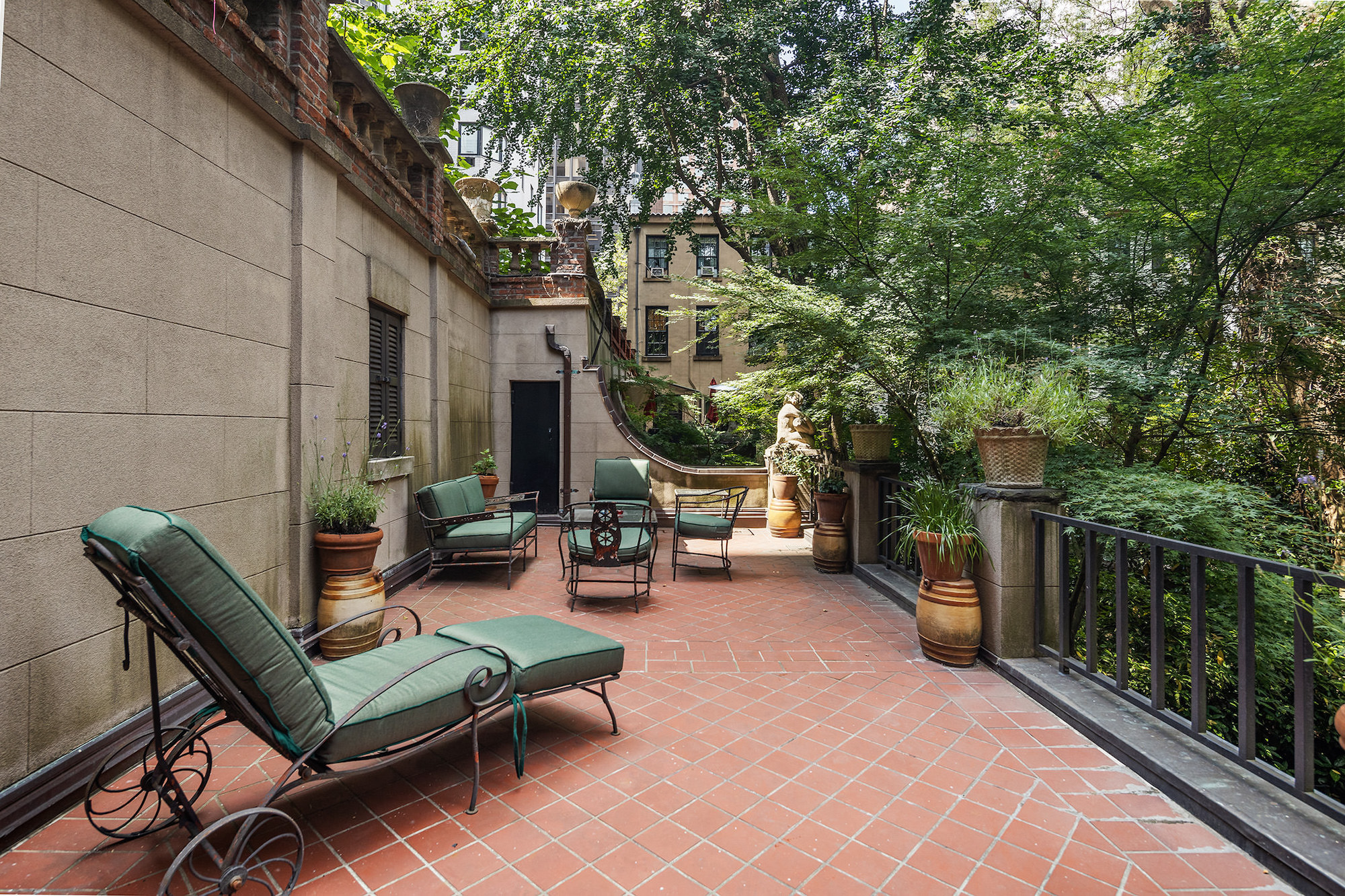 On the home’s top floor is a full studio apartment with a setback terrace overlooking the gardens. A renovated bath has floor-to-ceiling tile and a rain shower. Back on the lower level is a finished cellar with laundry and storage.