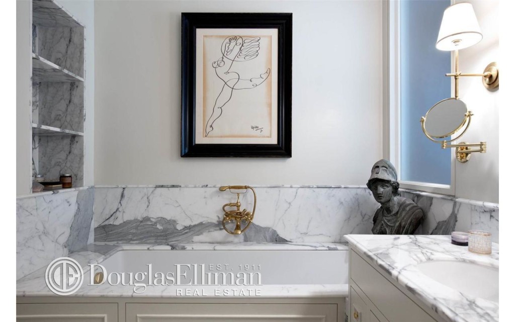 The opulence happens in the bath, where there’s yards of marble and gold fixtures; we’re wondering about that stone bust lurking above the tub, but it’s certainly a reminder that there’s always an audience of one sort or another when we live in New York City.