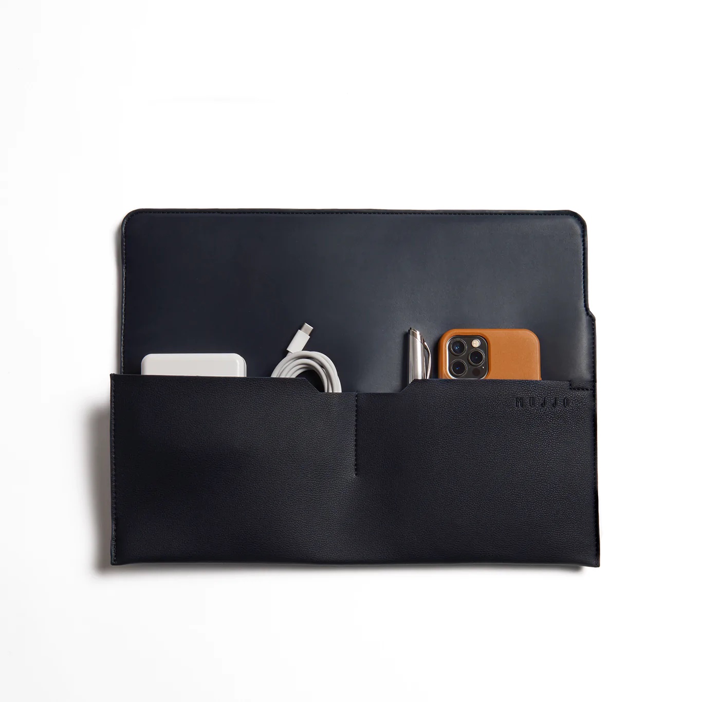 This stylish laptop sleep is large enough to fit a 14-inch MacBook Pro. It’s made of vegan leather with foam-padded pockets and has waterproof fabric and lining. The magnetic opening (on the side) is both secure and fast-opening. In addition to the laptop sleeve, there are additional smaller pockets to hold a smartphone, pen, chargers, etc. The laptop sleeve is available in black and in navy. Envoy 14-inch Laptop Sleeve, $95 at Mujjo |
