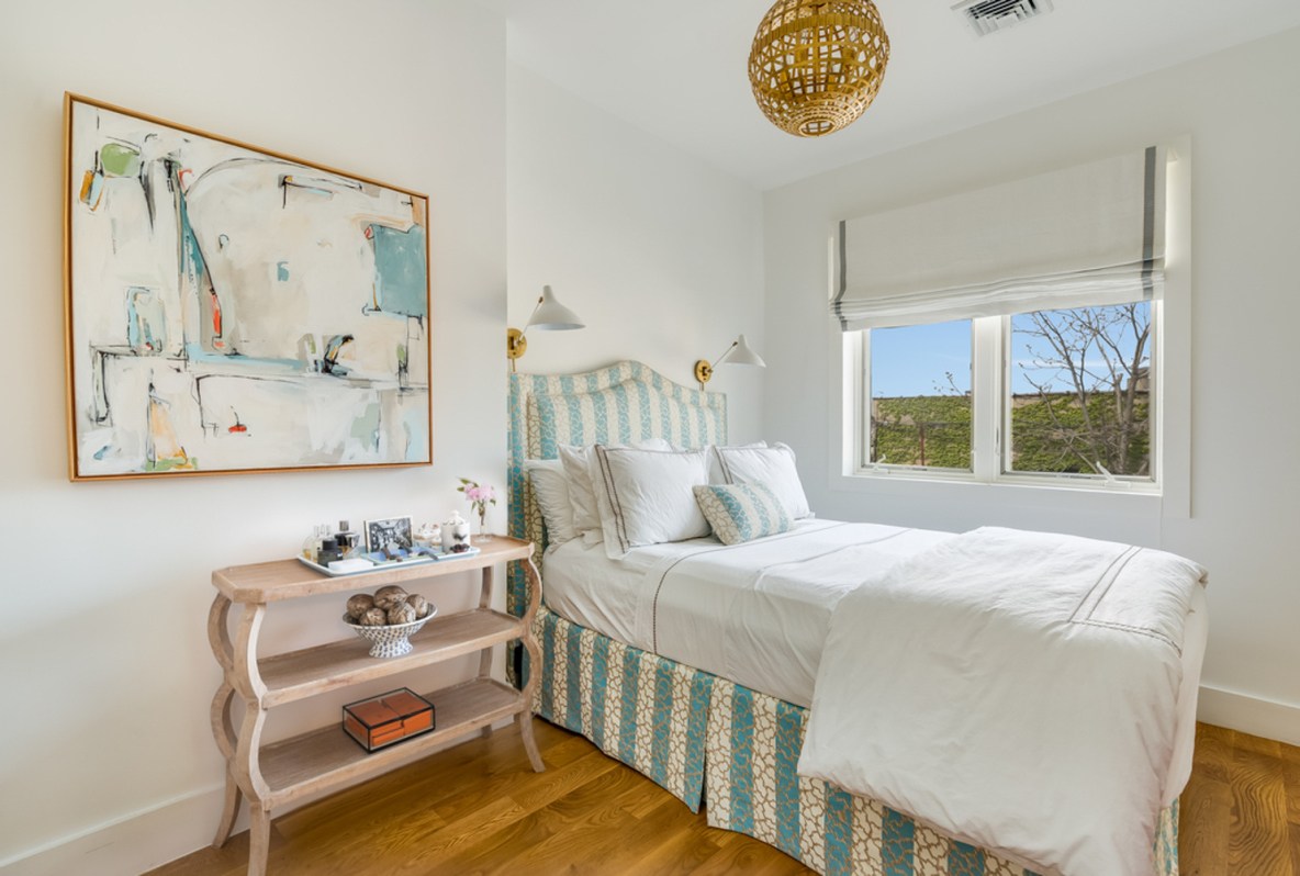 The bright and cheerful windowed kitchen has durable and attractive quartz countertops, stainless steel appliances including a Bertazzoni range, and ample storage space. One word of advice, though, for anyone hoping to sell their home’s owner’s duplex for $2.5 million: Don’t put the microwave over the stove.